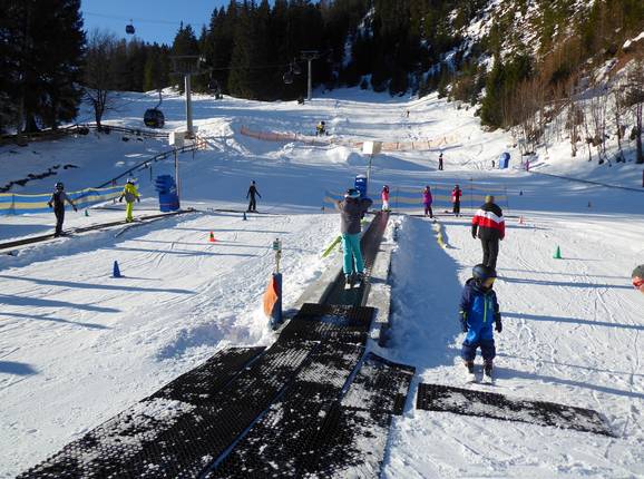 Het afgebakende Kinderland met transportbanden, sneeuwcarrousel en tal van attracties ligt direct bij het middenstation van de Kreuzjochbahn. De kleintjes (vanaf 3 maanden) worden verzorgd en begeleid in de opvangruimte van de Schischule Stubai, terwijl de ouders ontspannen hun bochten naar het dal maken en genieten van de skidag. Wie al wat meer kan, gaat naar de oefenweide Schanzlin, waar je met een eigen sleeplift, een schotellift en een touwlift stap voor stap het liften kunt oefenen.