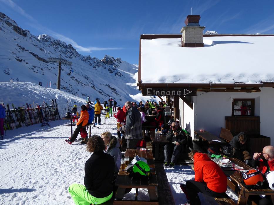 Als hoogste hut in het skigebied Schlick 2000 heeft de Sennjochhütte natuurlijk een plekje in de zon. Het zonneterras en de ijsbar zijn de hele dag door goed bezocht. Goede keuze aan soepen en klassieke hutgerechten, van braadworst tot Germknödel.