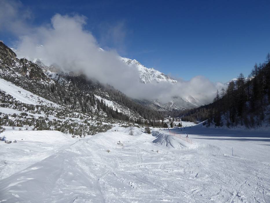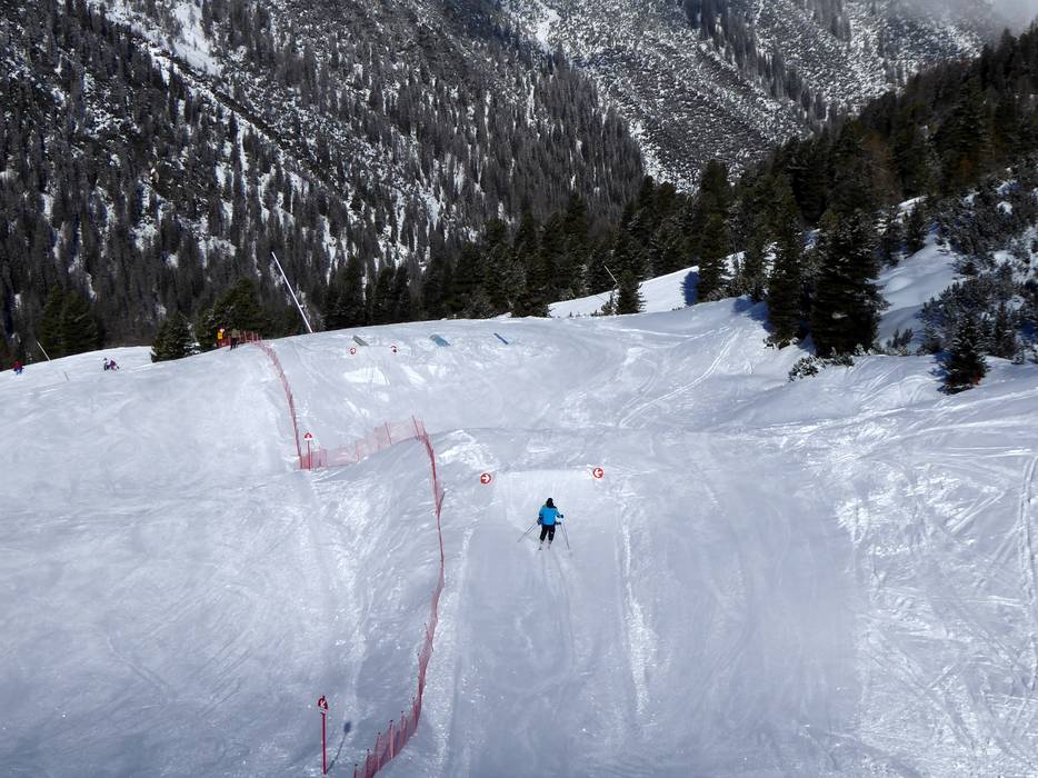Nauwelijks helling op de Panorama-afdaling tussen het dalstation van de 4-persoons stoeltjeslift Sennjoch en het middenstation van de Kreuzjochbahn. - een paar off-piste /Tiefschneegedeelten