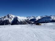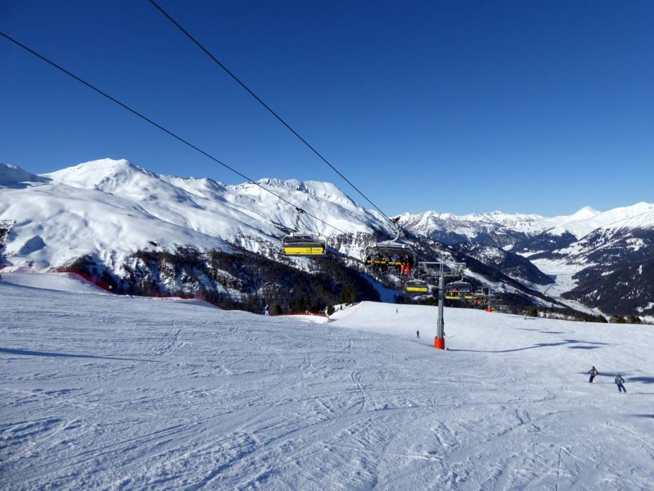 Brede pistes overheersen in Schöneben De gezonken kerktoren in de Reschensee Uitzicht vanaf Schöneben over het dal