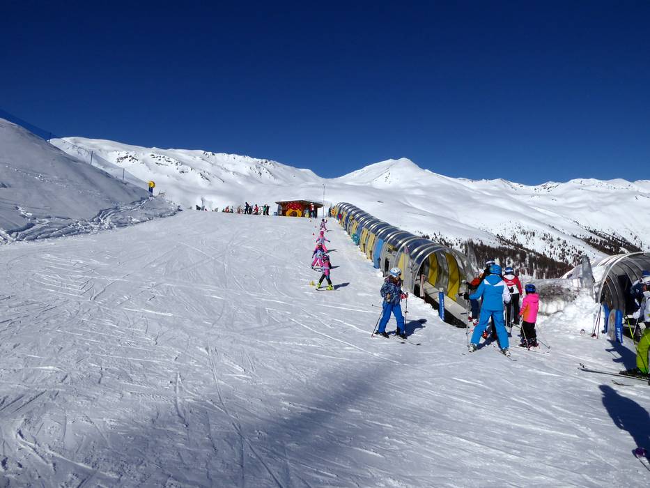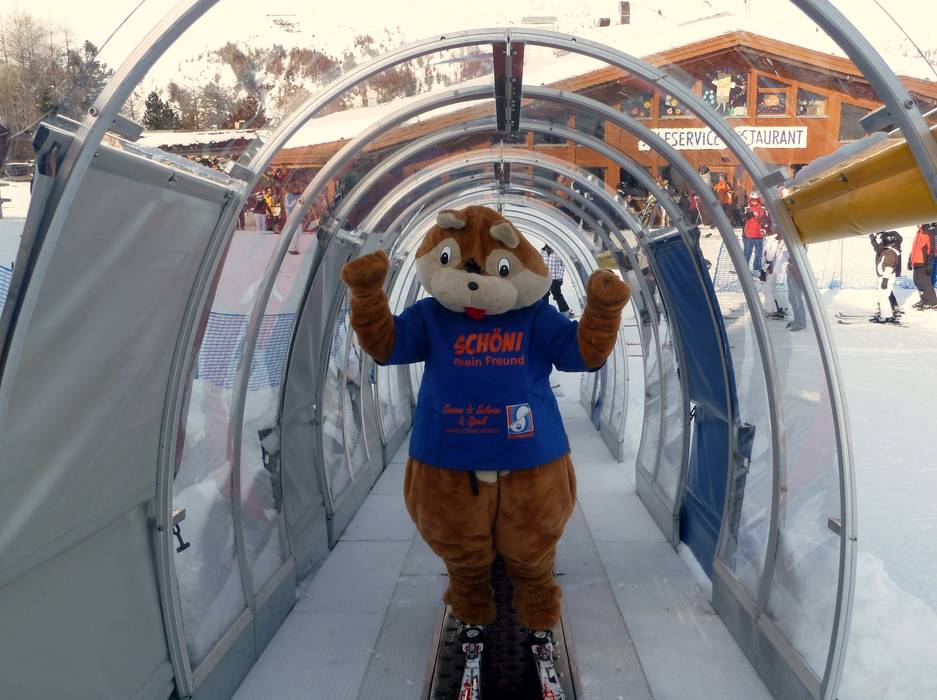 Direct aan het bergstation van de Schönebenbahn, op 2150 meter hoogte, ligt Schöni's Kinderland. Hier voelen de kleintjes zich helemaal thuis bij de transportbanden en de kindercarrousel. Schöni bezoekt het Kinderland ook regelmatig.