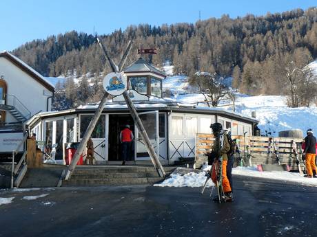 Après-ski (hutten, bars, sneeuwbars, cafés, feestzalen) Scuol – Motta Naluns Bij de dalstations zijn gezellige bars beschikbaar om de skidag af te sluiten. In het skigebied zelf kun je ook terecht in paraplubars of de dag afsluiten in de ligstoelen in de zon.