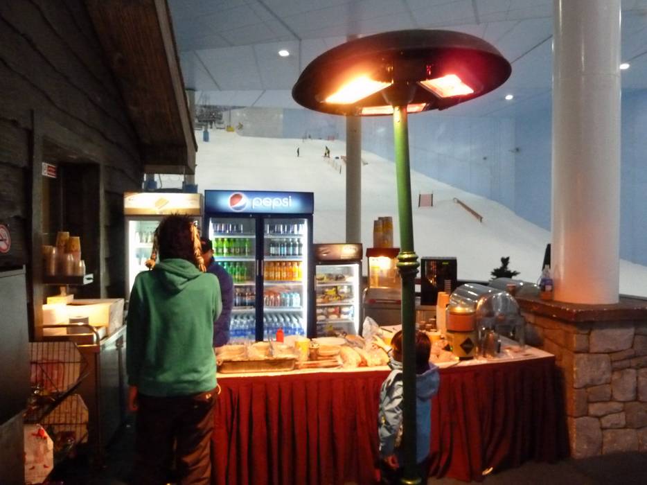 Bij de ingang van de skihal en met uitzicht op de pistes