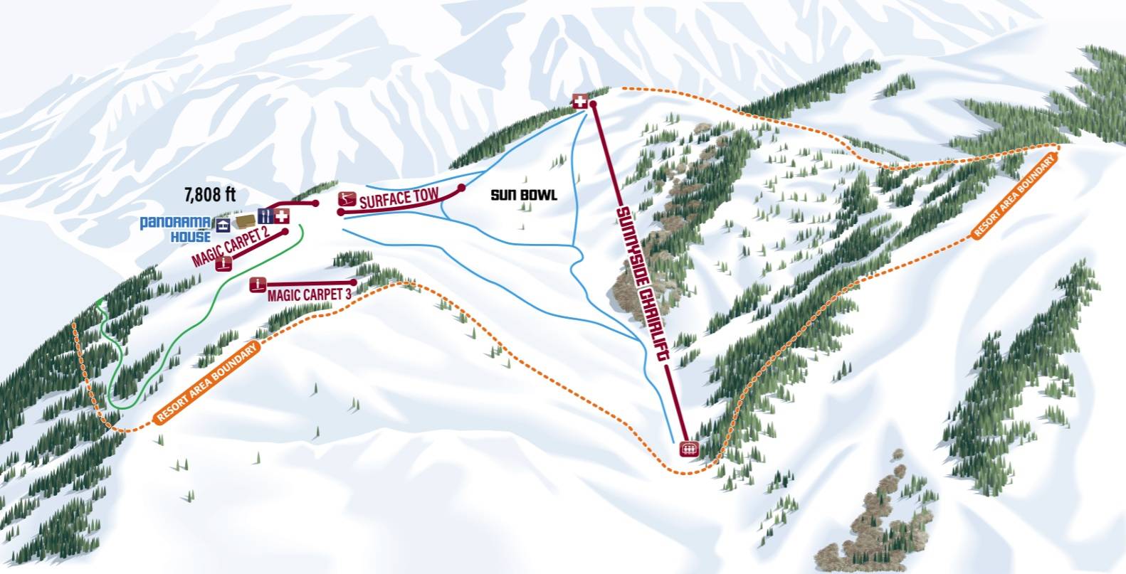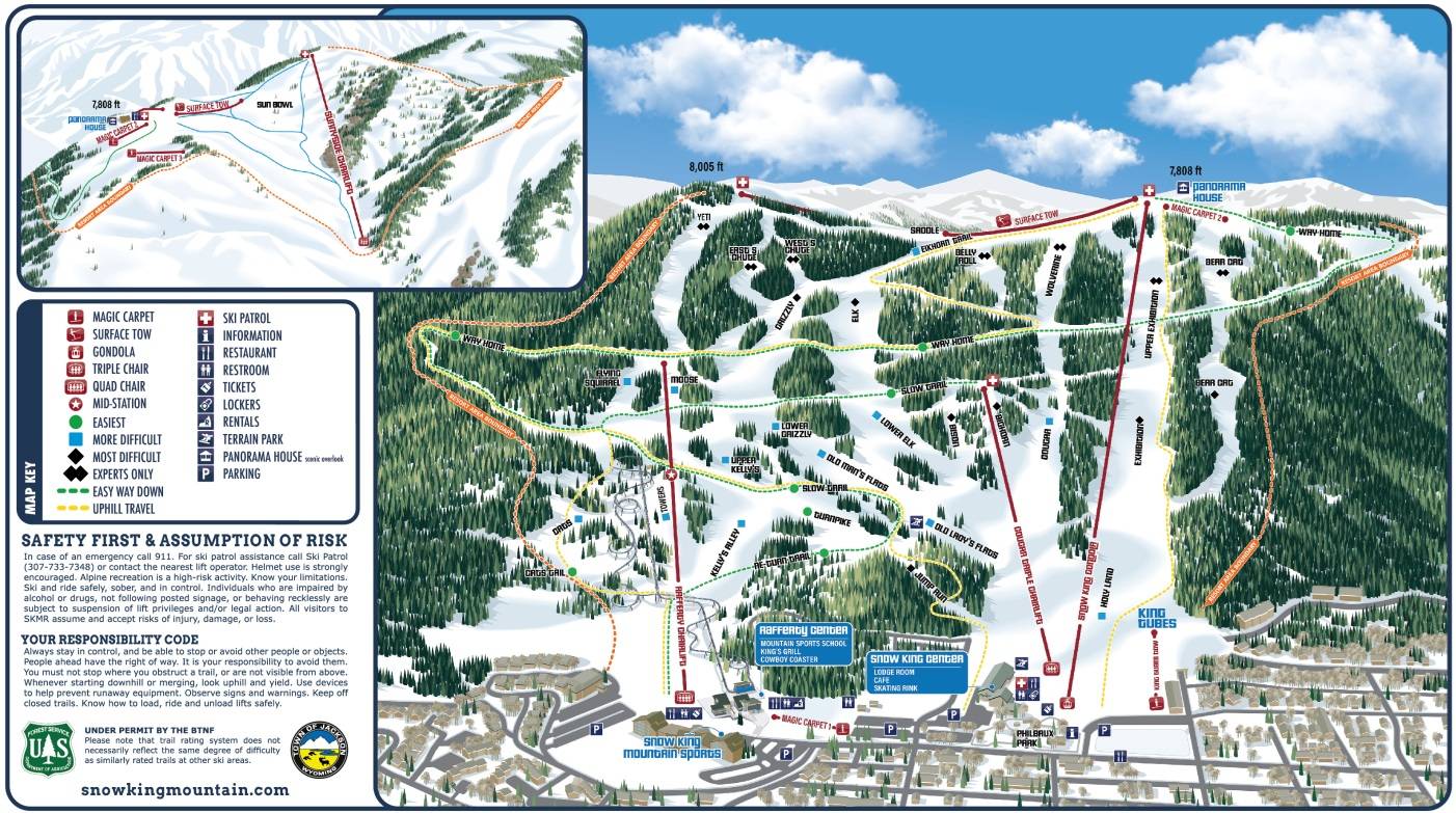 Het pisteplan van Snow King Mountain geeft beide zijden van het skigebied goed weer. Alle liften en afdalingen zijn ingetekend. Op de achterkant vind je meer informatie over het wintersportgebied.