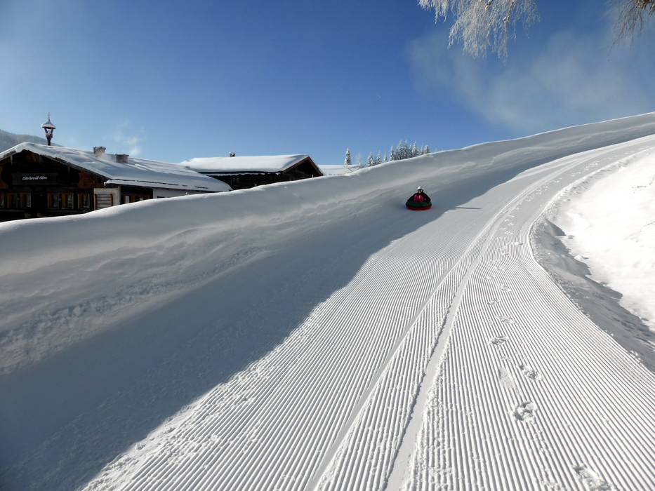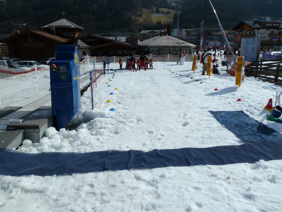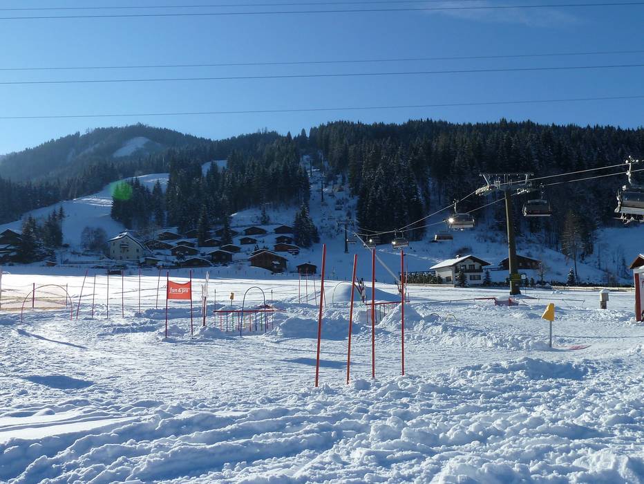 Leren skiën als een wereldkampioen. In de voetsporen van Hermann Maier. Kinderlanden bij het dalstation van de sleeplift Zeitmesstrecke en bij het dalstation van de spacejet 1.