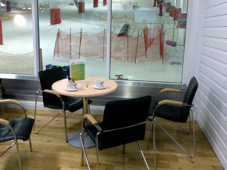 In het zelfbedieningsrestaurant kun je de dag afsluiten met een drankje. Van daaruit heb je een goed uitzicht op het skigebied door de panoramische ramen.