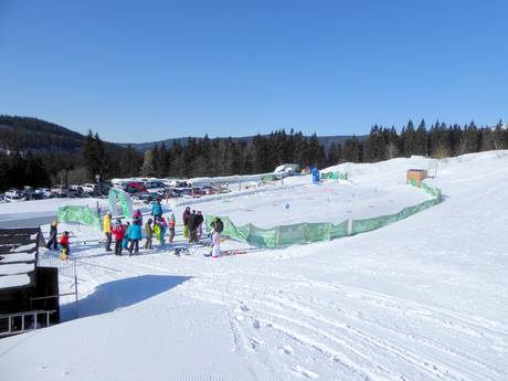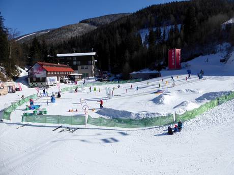 Direct naast het dalstation Medvědín bevindt zich het kinderland van de skischool Skol Max. Op een transportband kunnen de kleintjes hun eerste bochten in de sneeuw oefenen.