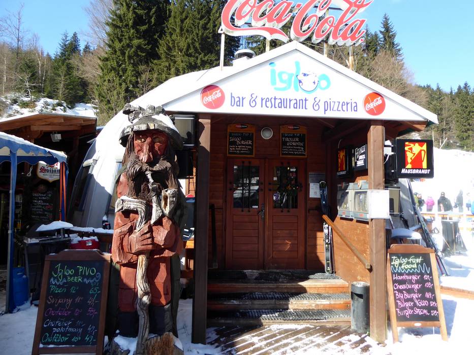 De Igloobar biedt Tsjechische specialiteiten en huisgemaakte pizza’s. In de gezellige stube of op het verwarmde terras kun je heerlijk vertoeven. ’s Middags lokken koffiespecialiteiten en taart.