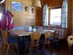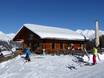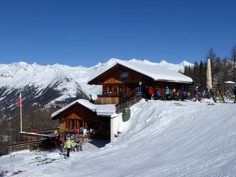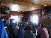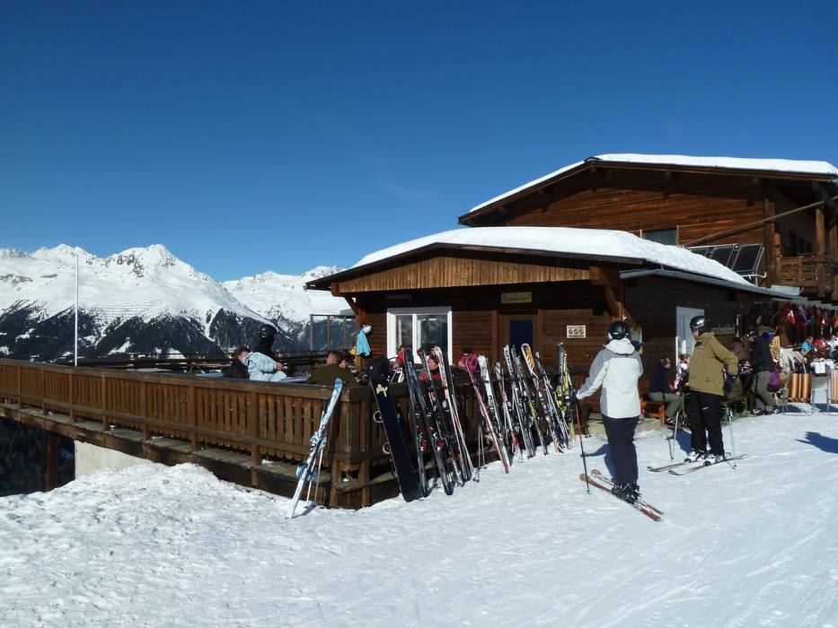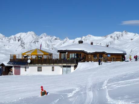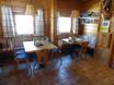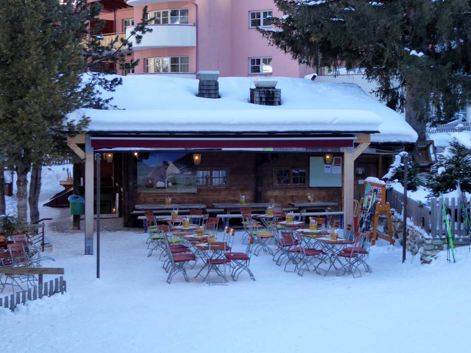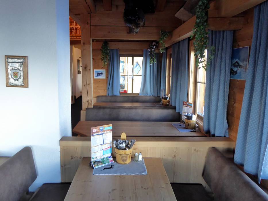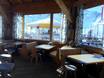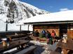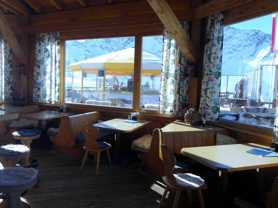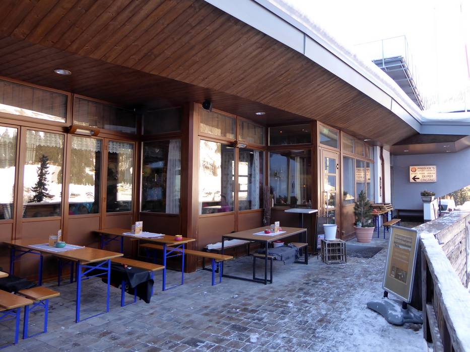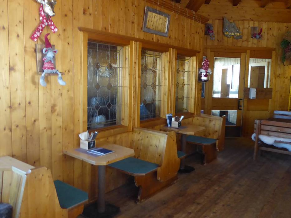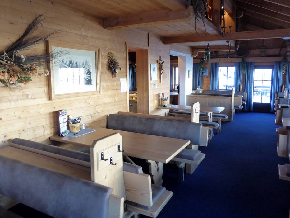 De gezellige skihut heeft twee gedeeltes. Op de bovenverdieping is er een bar met zonneterras, beneden is er een restaurant, ook met een zonneterras.