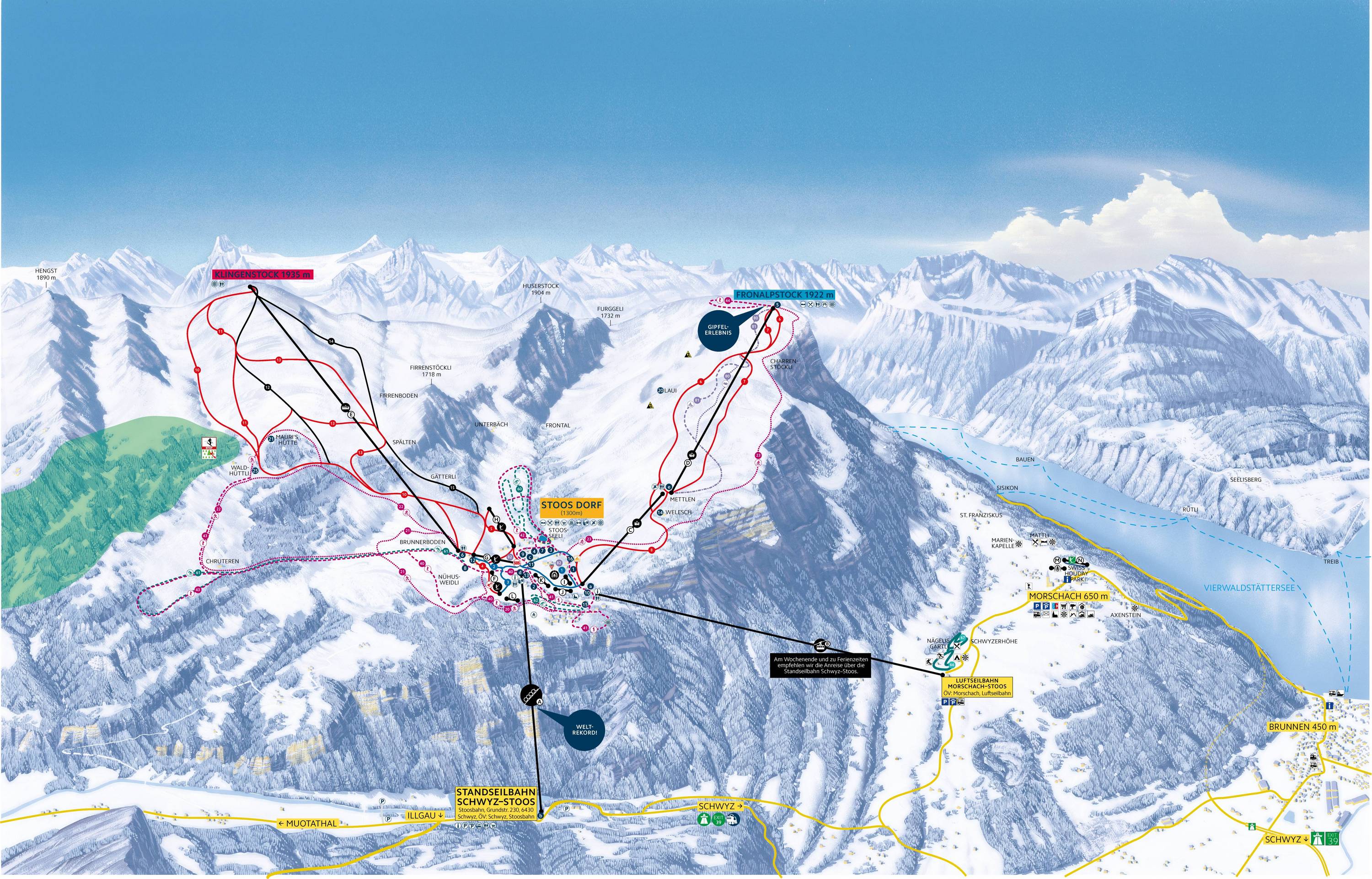Het pisteplan geeft het skigebied van Stoos met de Klingenstock en de Fronalpstock zeer goed weer. Alle pistes en skiroutes zijn ingetekend en beschreven. Er zouden nog extra informatie over de liften toegevoegd kunnen worden. Daarnaast zijn ook de horecagelegenheden, prijzen en andere activiteiten opgenomen.