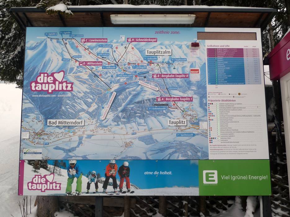 Het pisteplan van de Tauplitz is overzichtelijk en informatief. Er zouden echter meer hoogteaanduidingen kunnen worden toegevoegd. Op het pisteplan staan ook twee routes aangegeven, de grote Alm- en de Panoramaronde, die de gasten geweldige mogelijkheden bieden om het skigebied te leren kennen en ervan te genieten.