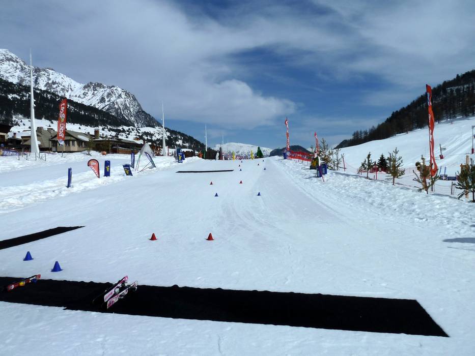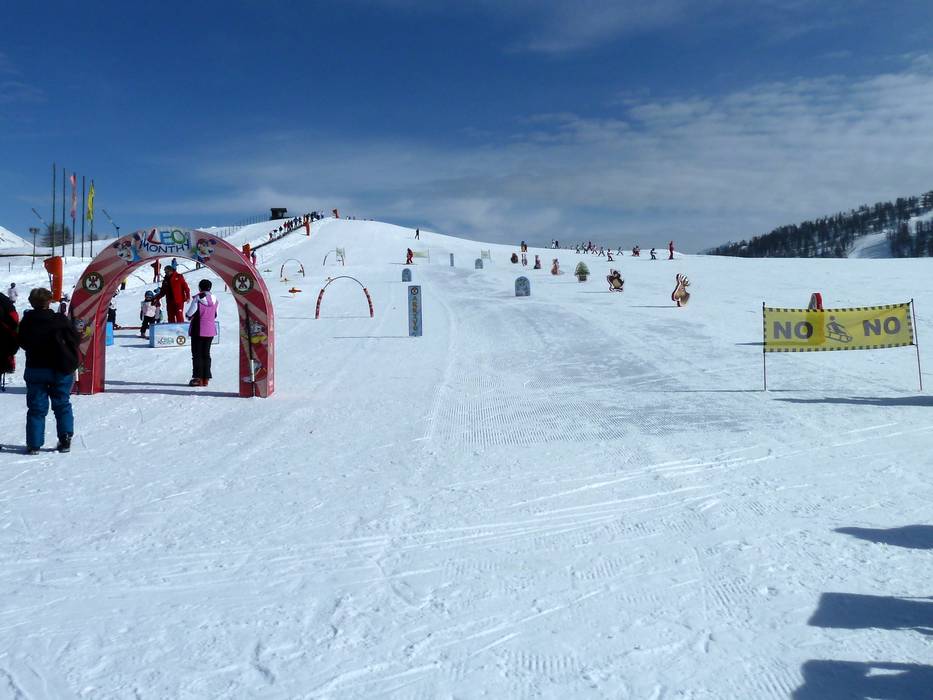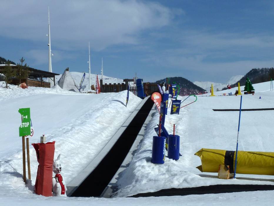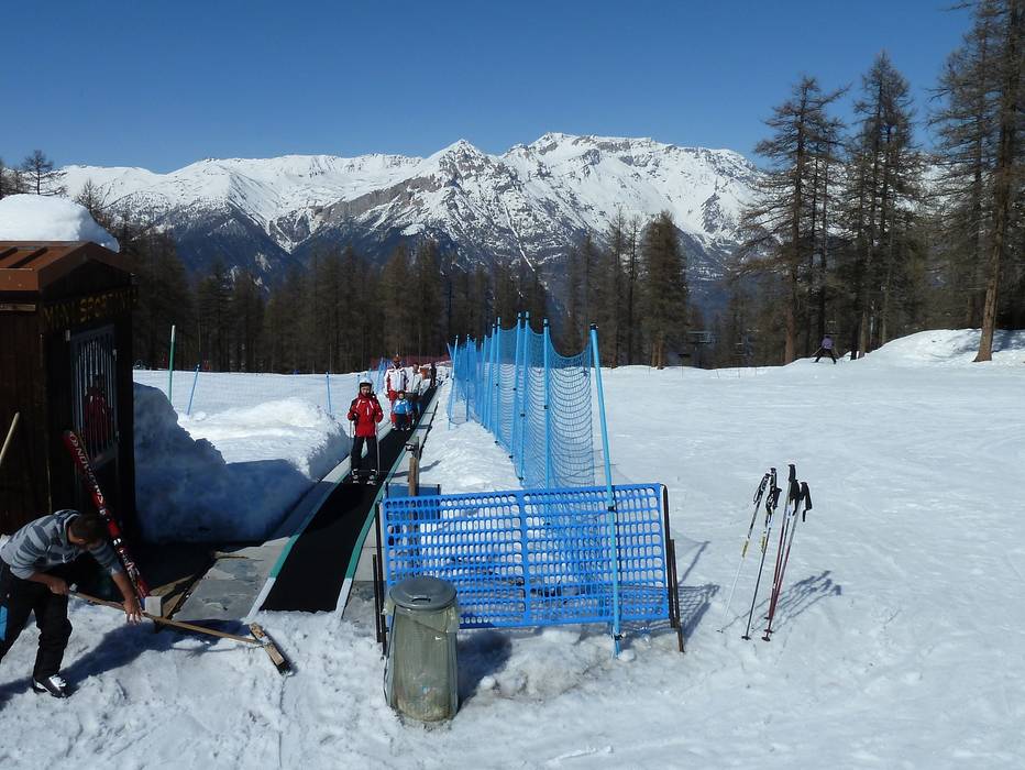 In het Kinderland Sportinia in Sauze d'Oulx is er een transportband en lesmateriaal in een afgebakend terrein.