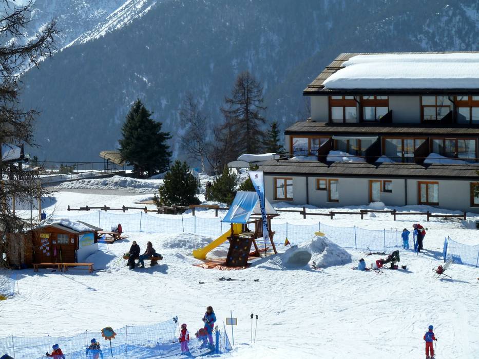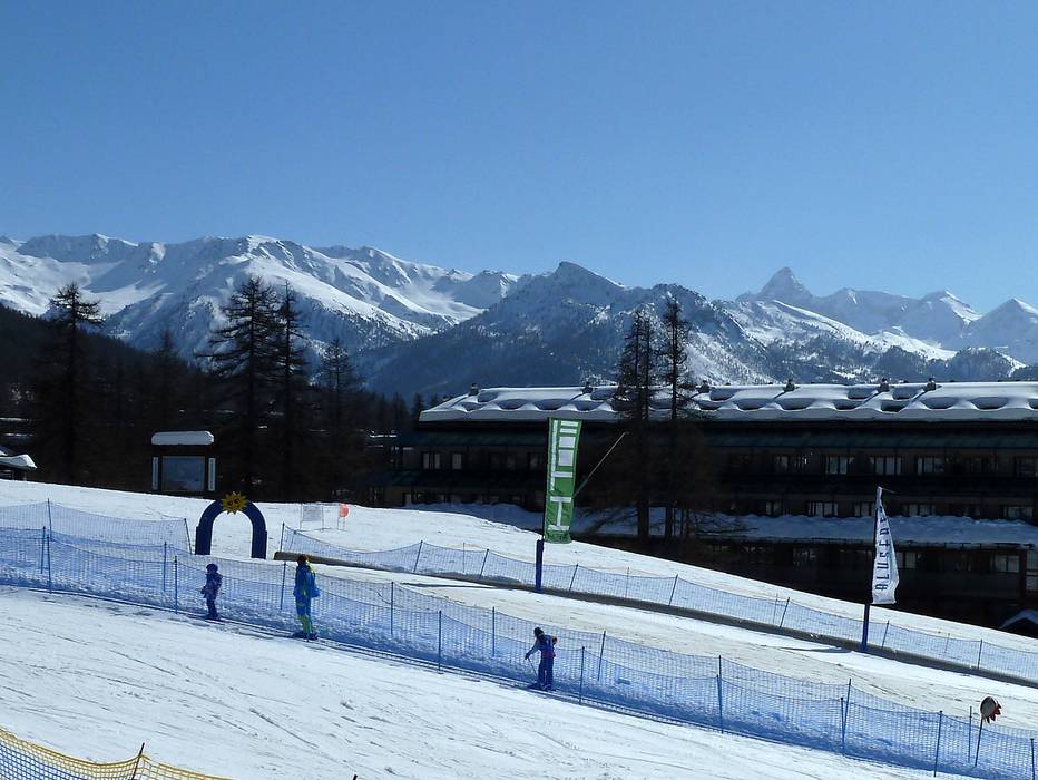 Het Kinderland Leo Monthy ligt centraal in Sestrière en biedt een transportband en kindvriendelijke elementen voor speels leren.