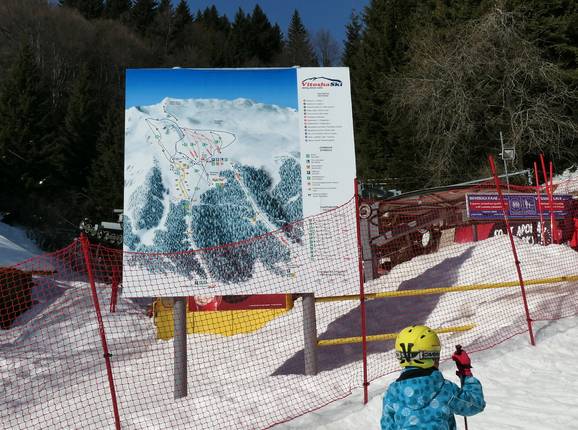 Het pisteplan geeft het skigebied in grote lijnen goed weer, maar er worden meerdere liften weergegeven die niet meer in gebruik zijn.