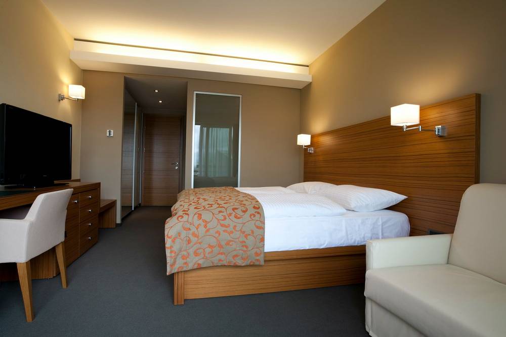 Het beste van alles is dat het hotel beschikt over een aangesloten aquapark dat door hotelgasten gebruikt kan worden. Hier kunt u genieten van alles, van sauna’s tot bubbelbaden. Er is zelfs een klimwand boven het zwembad, voor het geval u na een dag buiten uw spieren nog wilt gebruiken. Voor wie liever ontspant, zijn er diverse sauna’s en behandelingen in het wellnesscentrum, evenals een bowlingbaan en een bioscoopzaal.