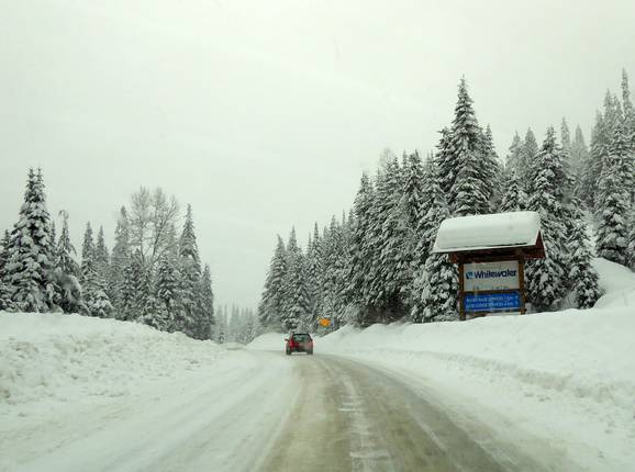 Het skigebied Whitewater ligt in de Kootenay Rockies, aan de voet van de Ymir Mountain, nabij Nelson in British Columbia. Vanuit Nelson volg je Highway 6 over de 958 meter hoge Apex Summit tot aan de afslag naar het skigebied. Via een bergweg rijd je vervolgens omhoog naar het skigebied Whitewater. De eerste 3 km van de bergweg zijn nog geasfalteerd, daarna gaat de weg over in een grindweg tot aan de stoeltjesliften. Na ongeveer 5 km bereik je de driestoeltjeslift Glory Ridge, waar beperkte parkeermogelijkheden zijn. Na nog eens 4 km kom je bij het dalstation van de andere stoeltjesliften. Hier zijn voldoende parkeerplaatsen beschikbaar. De weg wordt in de winter zeer goed sneeuwvrij gemaakt en onderhouden.
