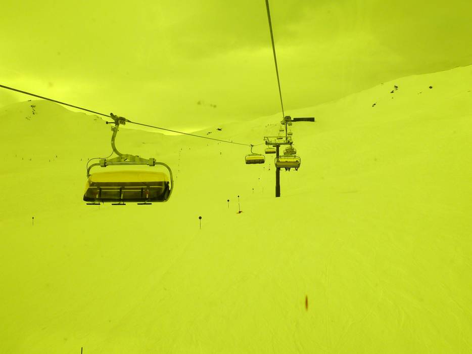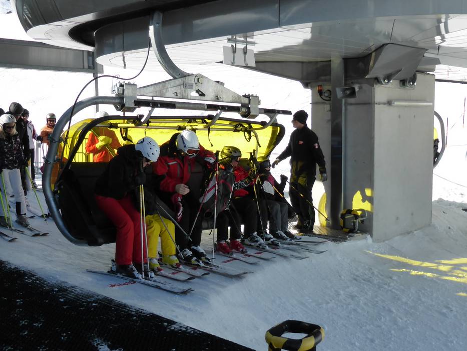 De 6-persoons stoeltjeslift Frühmesser X-press heeft gele weerkappen.