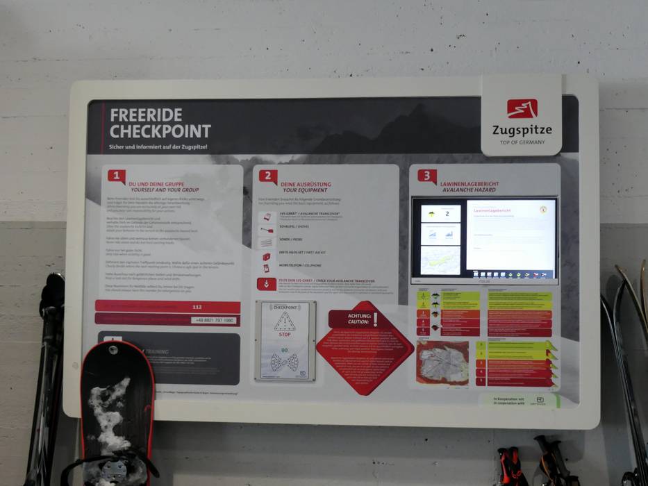 Op de Zugspitze zijn er geen officiële zware afdalingen. Bij voldoende sneeuwval zijn er echter veel onbeveiligde poedersneeuwhellingen te vinden. Daarnaast zijn er bij het Gletscherbahnhof ook freeride-checkpoints, waar het lawinebericht beschikbaar is en waar de LVS-apparaten op hun werking gecontroleerd kunnen worden.