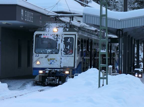 Op het centraal station van Garmisch-Partenkirchen kun je direct instappen in de Bayerische Zugspitzbahn (tandradbaan). De rit naar het skigebied op de Zugspitze duurt ongeveer 75 minuten en je passeert de volgende stations: Hausberg, Kreuzeck-/Alpspitzbahn, Hammersbach, Grainau, Eibsee, Riffelriß en Zugspitzplatt. - skibussen